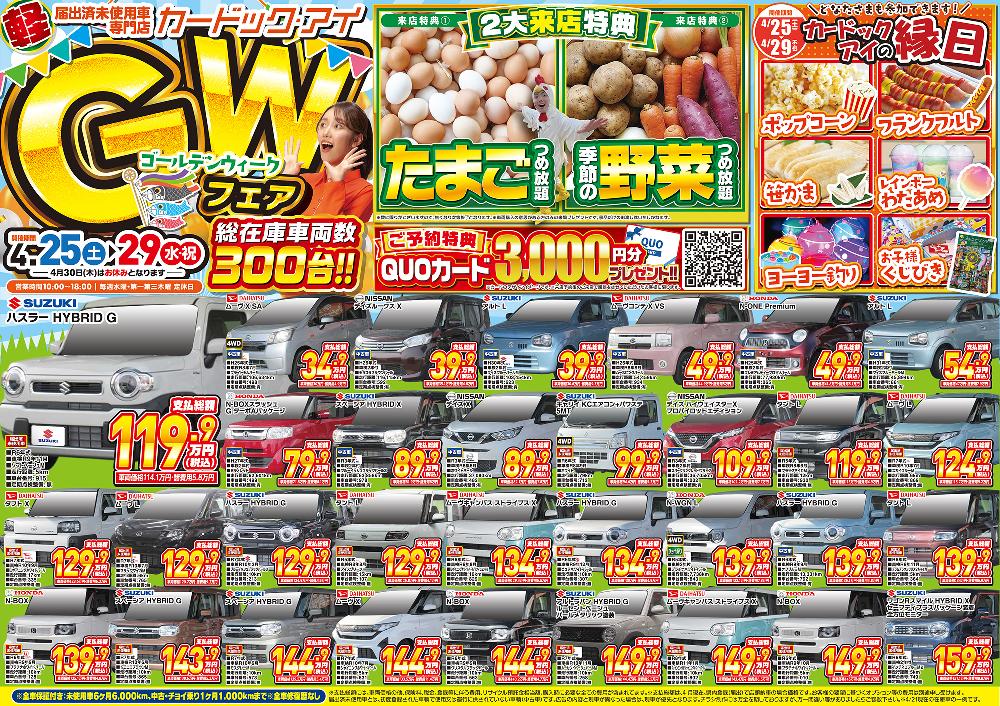 【総在庫300台!!】GWは家族みんなでクルマ選び&お祭りへ! 軽未使用車専門店カードックアイ『ゴールデンウィークフェア』開催!