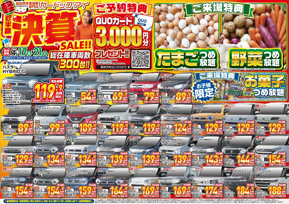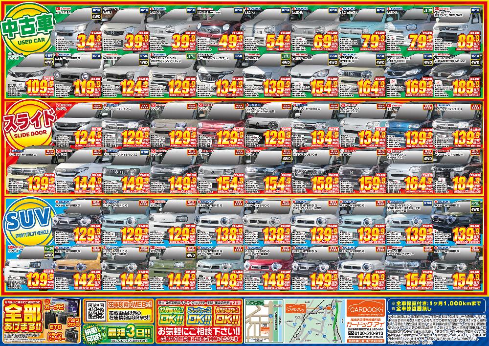 チラシ・キャンペーン|株式会社カードック・アイ CAMPAIGN チラシ・キャンペーン HOMEチラシ・キャンペーン 2026年 2026.04.15 キャンペーン 【総在庫300台】カードック・アイ四半期決算SALE開催!野菜・お菓子詰め放題も♪ 2026.03.04 キャンペーン 宮城・柴田でタイヤ交換なら車検のコバック柴田店へ! 2026.02.03 キャンペーン 4WDの人気車がぞくぞく入荷中!! 2026.04.16 チラシ 【最新チラシ表面!】軽未使用車専門店カードック・アイ 2026.04.16 チラシ 【最新チラシ裏面!】軽未使用車専門店カードック・アイ 2026.01.13 キャンペーン 他店見積もり徹底対抗!! 1 ARCHIVE 2026 2025 2024 2023 CATEGORY お知らせ キャンペーン チラシ